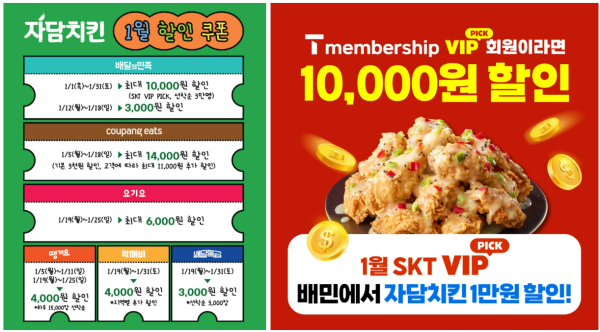 이번 행사는 1월 한 달간 SK텔레콤 VIP 회원 선착순 3만 명을 대상으로 하며, T멤버십 앱 내 SKT VIP PICK 메뉴에서 자담치킨 할인 쿠폰을 내려받아 배달의민족 앱을 통해 포장 또는 배달 주문 시 사용할 수 있다.