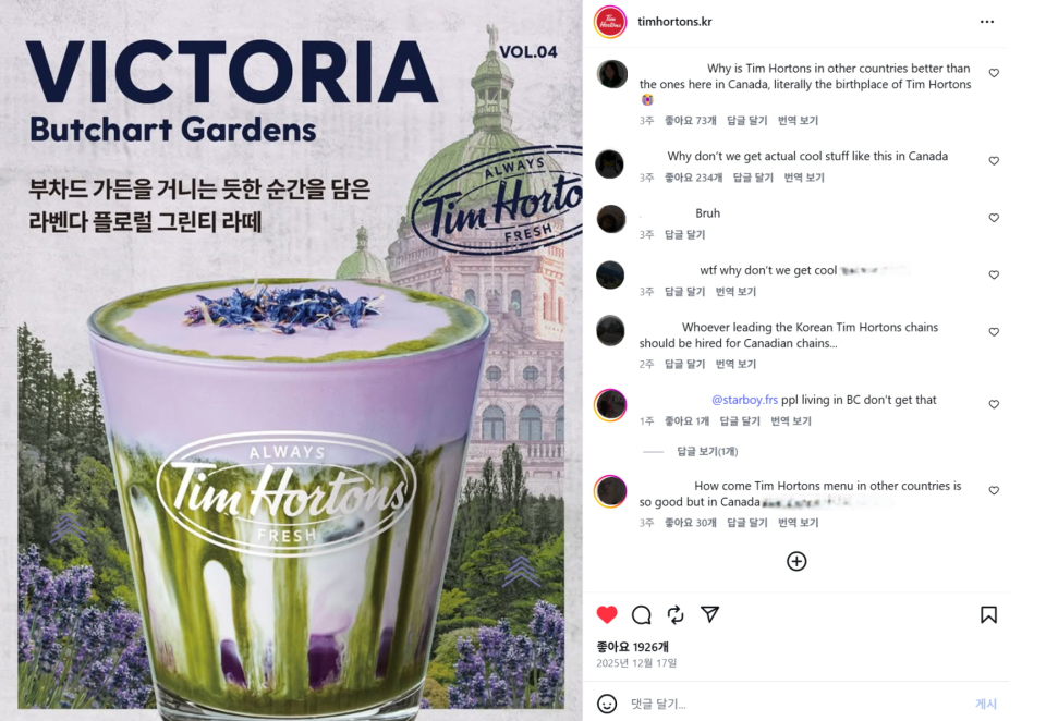 팀홀튼 SNS에 게시된 ‘빅토리아 부차드 가든’ 메뉴 이미지(왼쪽)와 영어 댓글. [사진=팀홀튼 코리아 인스타그램]