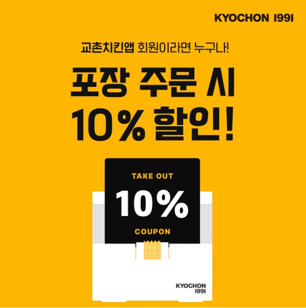 교촌치킨앱을 통해 포장 주문 시 자동 발급되는 10% 할인 쿠폰을 적용하면 되며, 1회 주문당 1매 사용 가능하다.