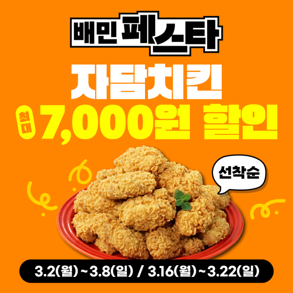 행사는 3월 2~8일, 16~22일 두 차례에 걸쳐 진행된다. 행사 기간 배민배달 주문 고객을 대상으로 매일 선착순 7천명에게 7천원 할인 쿠폰을 제공한다.